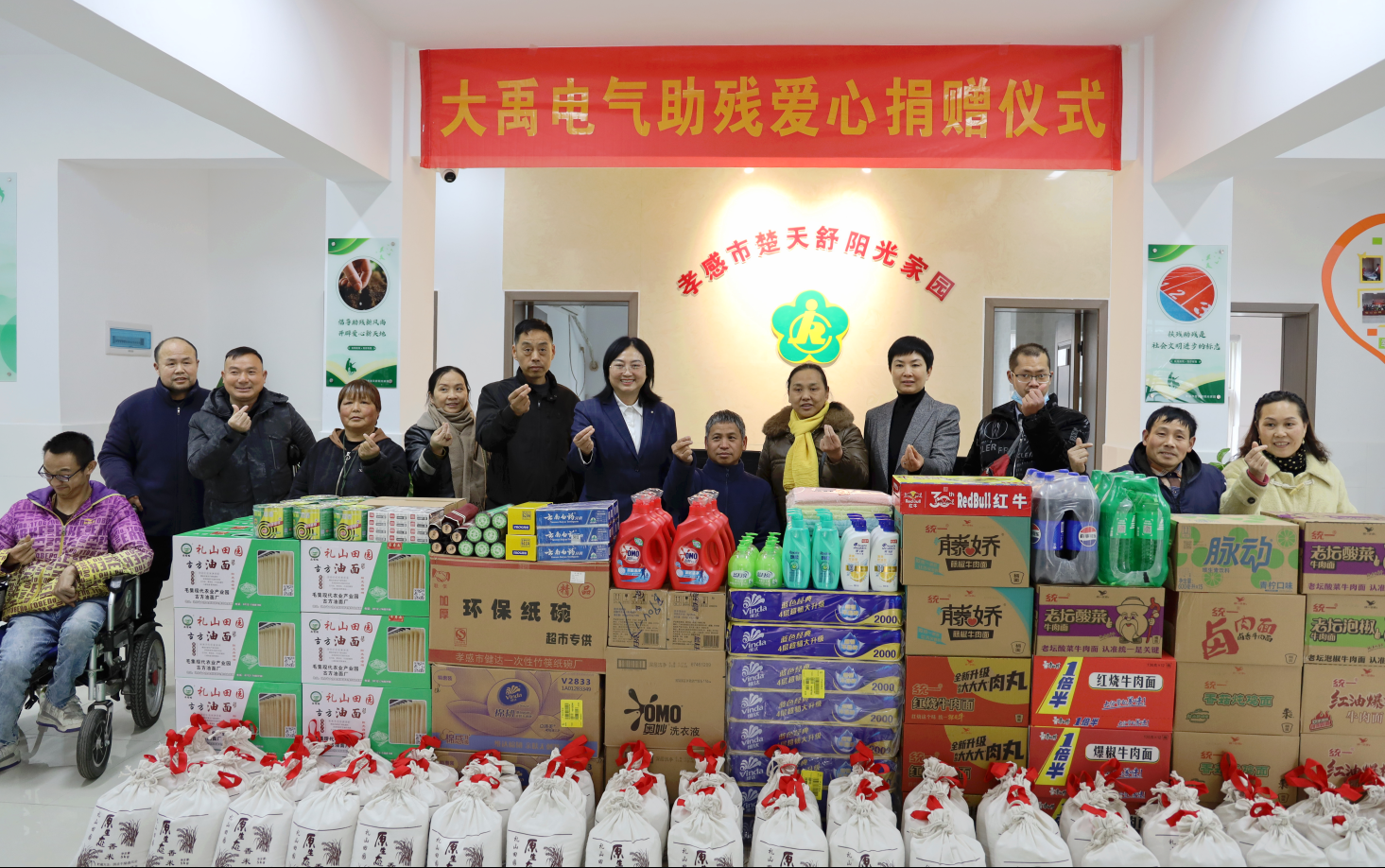 新春伊始,為認真貫徹2025年全省殘聯(lián)工作會議精神,持續(xù)擦亮“愛鑄荊楚”品牌,孝感市殘聯(lián)積極整合社會資源,大力實施“楚天舒陽光家園”服務升級行動。2月21日,孝感市愛心助殘就業(yè)創(chuàng)業(yè)企業(yè)聯(lián)盟主席單位——大禹電氣科技股份有限公司向孝感市“楚天舒陽光家園”捐贈價值3萬元的生活物資,推動陽光家園服務提檔升級。孝感市殘聯(lián)黨組書記、理事長朱麗玲,大禹電氣公司總經(jīng)理王琴等共同出席了捐贈儀式。20余名城區(qū)困難殘疾人現(xiàn)場領取了部分物資。